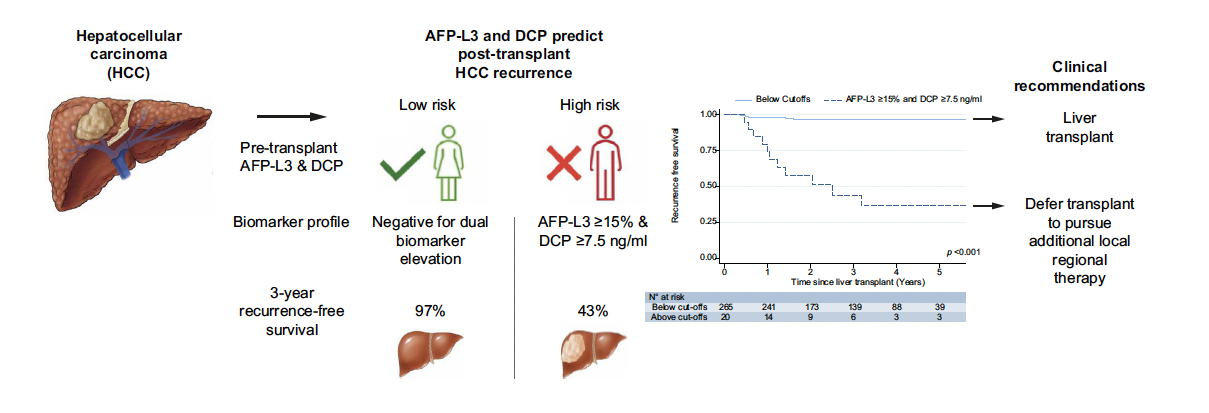Conclusions: Dual-positivity for AFP-L3>− 15% and DCP>−7.5 strongly predicted post-LT HCC recurrence. This model could refine LT selection criteria and identify high-risk patients who require additional locoregional therapy prior to LT.
