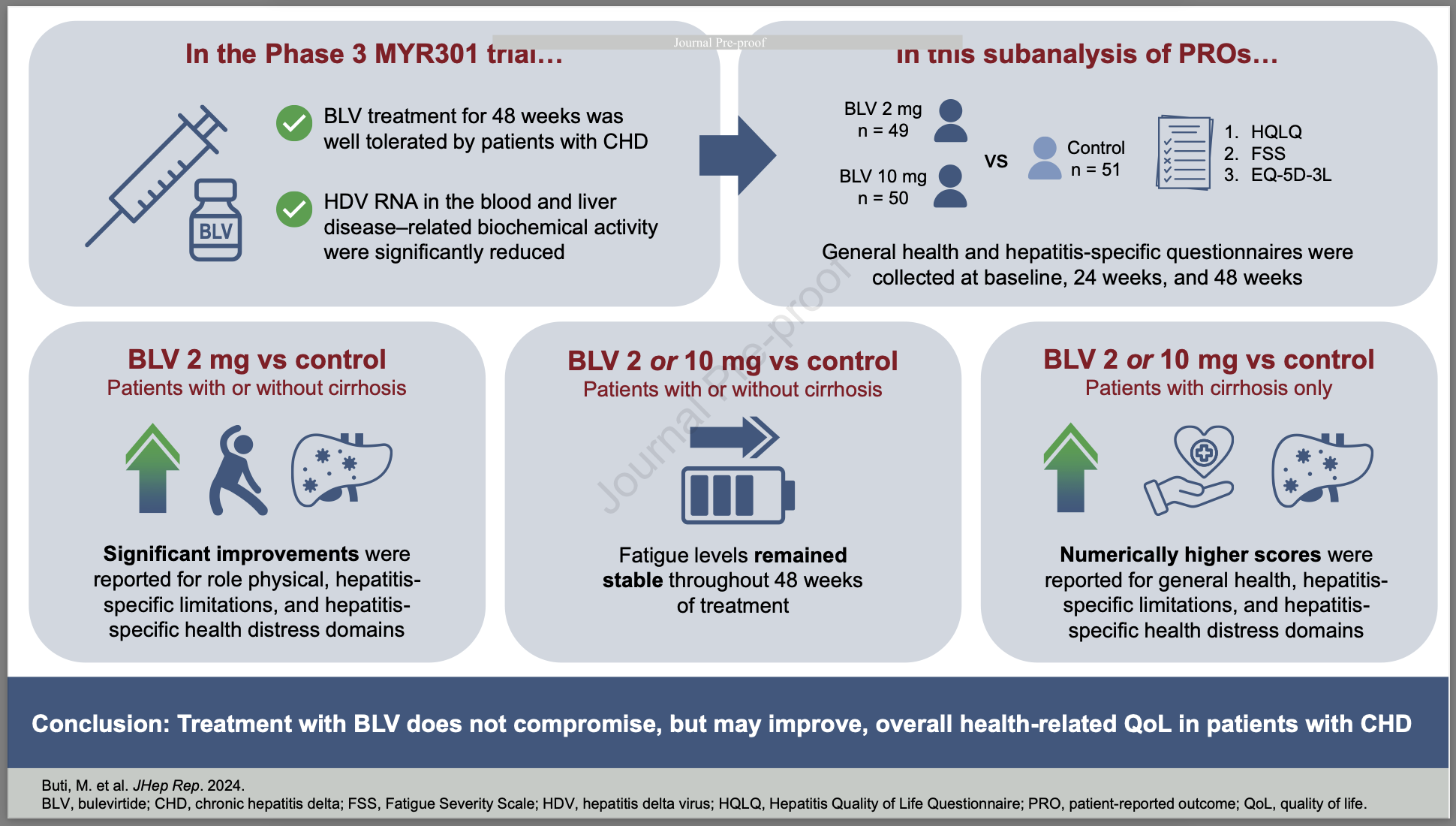 - Patients who received BLV vs no therapy for 48 weeks had improved physical and hepatitis-related QoL