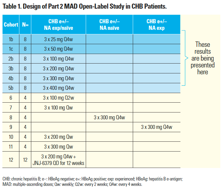 - Given the lack of a dose response with 100–400 mg Q4w JNJ-3989,⁷ cohorts 2b–5b (Table 1) were expanded from four to eight patients, and two lower dose cohorts 1b and 1c (25 and 50 mg Q4w, respectively) were added to study AROHBV1001.