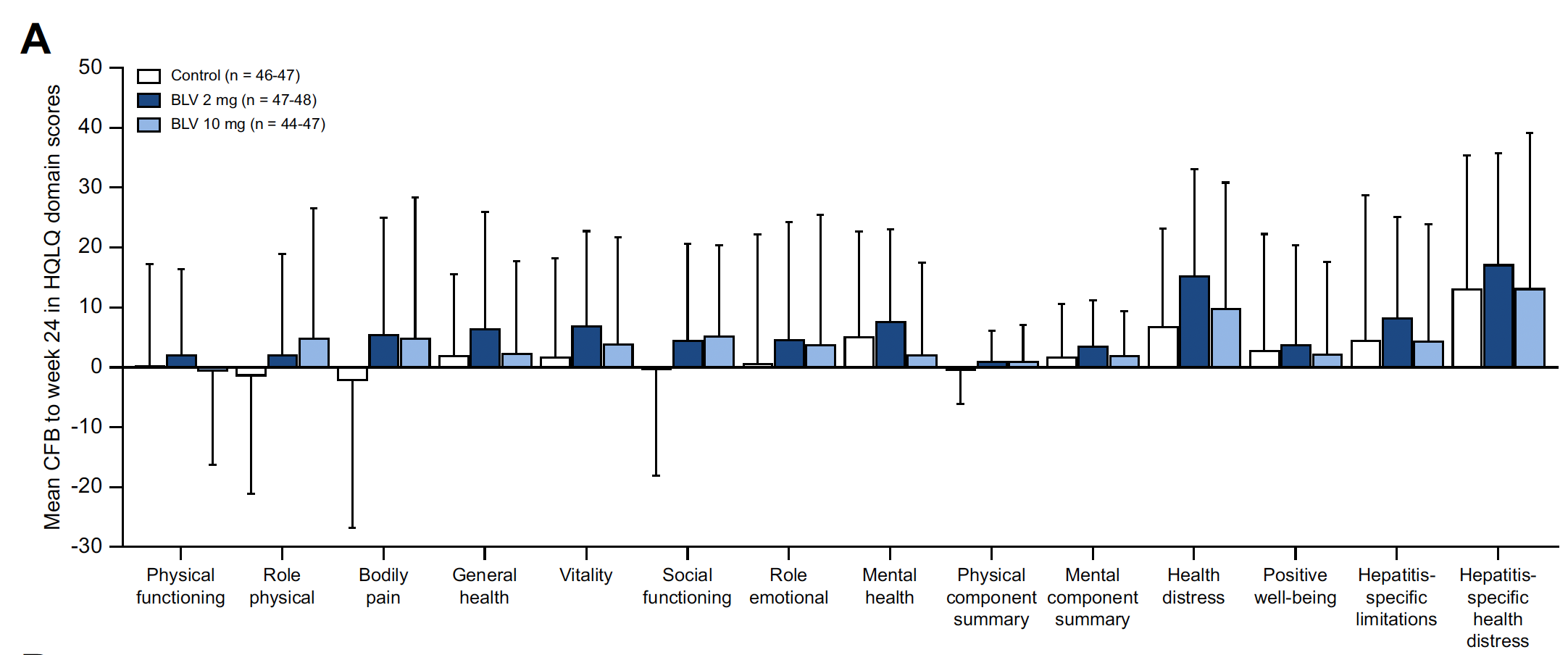 Methods: In an open-label, randomised, phase III trial, 150 patients with CHD and compensated liver disease were stratified by cirrhosis status and randomised 1:1:1 to no treatment (control), bulevirtide 2 mg/day, or bulevirtide 10 mg/day for 48 weeks. HRQoL was evaluated by the following patient-reported outcome instruments at baseline, 24 weeks, and 48 weeks: EQ-5D-3L, Hepatitis Quality of Life Questionnaire, and Fatigue Severity Scale.