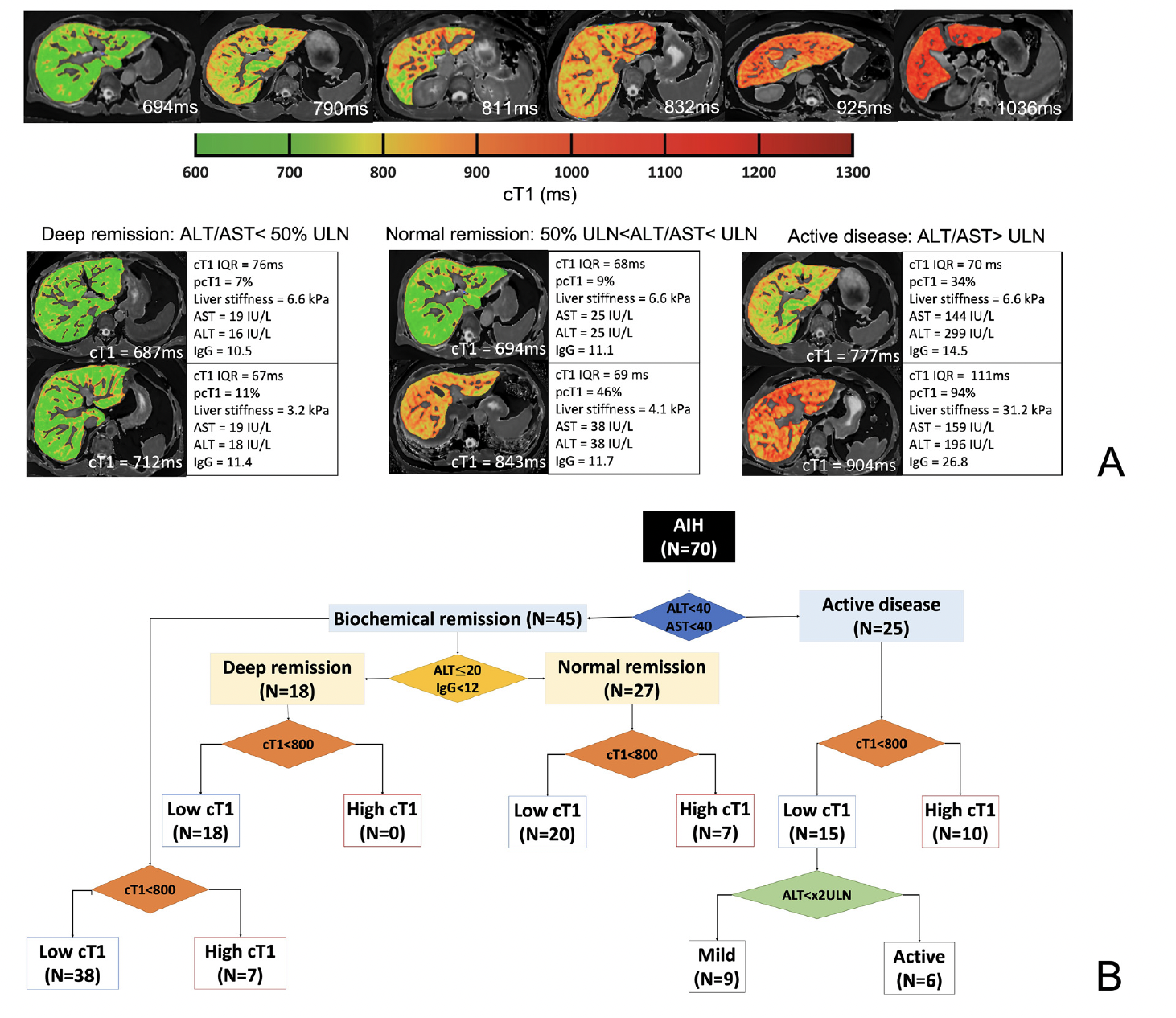 Methods 82 AIH patients, recruited from two sites between June and November 2019 as part of an observational cohort study, underwent non-contrast MRI alongside their standard clinical investigations. Correlations between iron-corrected T1 (cT1) and other markers of disease were investigated alongside the utility of imaging markers to risk stratify patients in biochemical remission. The impact of mpMR on clinical decision making was evaluated using pairwise t-tests. The discriminatory ability of the imaging markers was assessed using area under the receiver operating characteristic curves (AUCs).