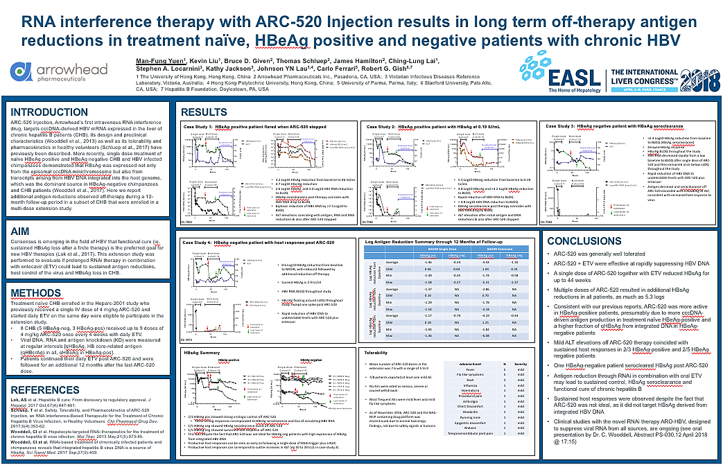 ARC-520 Injection, Arrowhead’s first intravenous RNA interference drug, targets cccDNA-derived HBV mRNA expressed in the liver of chronic hepatitis B patients (CHB). Its design and preclinical characteristics (Wooddell et al., 2013) as well as its tolerability and pharmacokinetics in healthy volunteers (Schluep et al., 2017) have previously been described. More recently, single dose treatment of naïve HBeAg positive and HBeAg negative CHB and HBV infected chimpanzees demonstrated that HBsAg was expressed not only from the episomal cccDNA minichromosome but also from transcripts arising from HBV DNA integrated into the host genome, which was the dominant source in HBeAg-negative chimpanzees and CHB patients (Wooddell et al., 2017). Here we report additional antigen reductions observed off-therapy during a 12-month follow-up period in a subset of CHB that were enrolled in a multi-dose extension study.