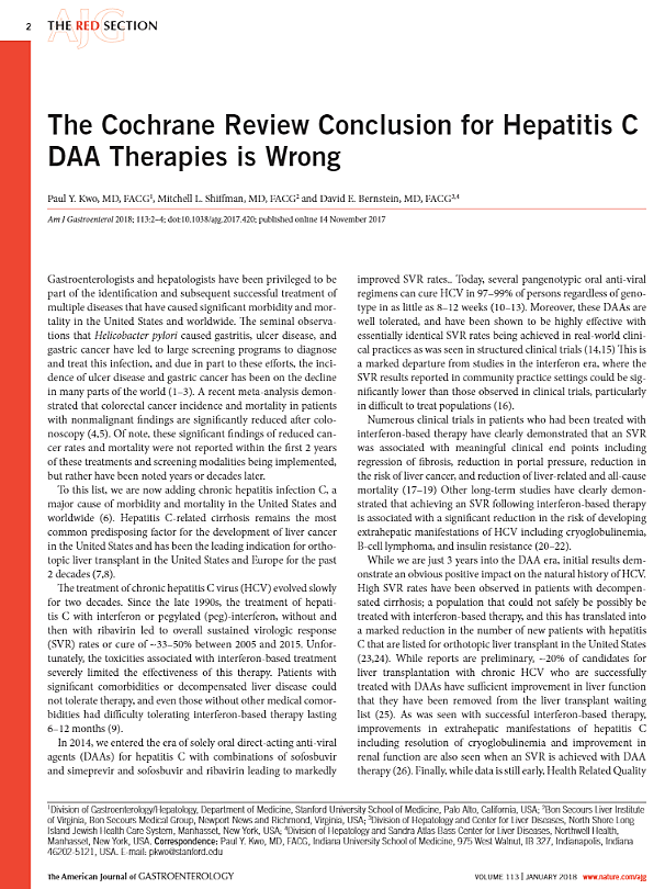 Snip from abstract: It is therefore surprising and disappointing that the recent Cochrane database review of DAAs for chronic hepatitis C concluded that DAA administration has little or no clinical relevance to patients with hepatitis C, stating that it was questionable if SVR has any clinical relevance ( 28 ). This manuscript correctly concluded that (i) the currently available DAAs offer high rates of SVR and cure HCV infection in nearly all patients treated with these medications and (ii) that there was no benefit of such treatments within the study duration that the DAAs were evaluated on the primary end points defined by the Cochrane group, which were hepatitis C-related morbidity, serious adverse events, and quality of life. However, none of these elements were considered primary end points of the DAA trials analyzed by this Cochrane analysis. This latter point represents a gross departure from the typical Cochrane methodology, which limits itself to the end points of the clinical trials examined and does not extrapolate these end points…