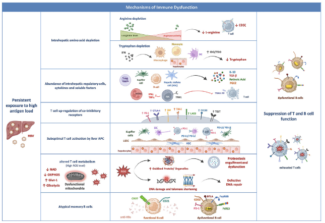 - Different factors contribute to the immunologic impairment in chronic HBV infection including the prolonged exposure to viral antigens, upregulation of co-inhibitory receptors, T-cell intracellular pathways defects, and the multiple regulatory mechanisms active within the liver.